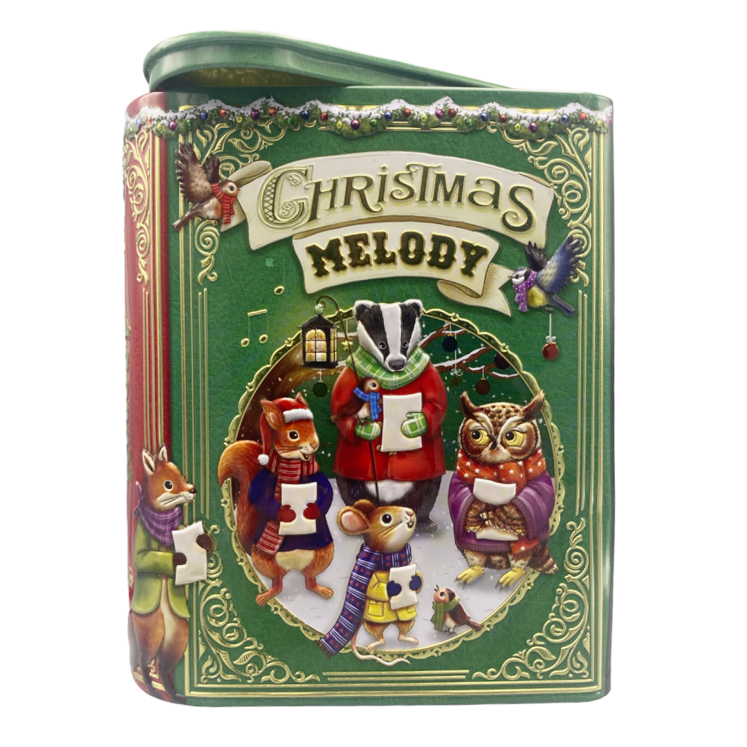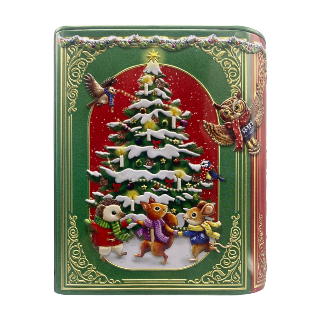 Nostalgica scatola a forma di libro. Un coro di animali si prepara per la vigilia di Natale.